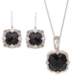 ONYX AND DIAMOND EARRINGS AND NECKLACE SET.
