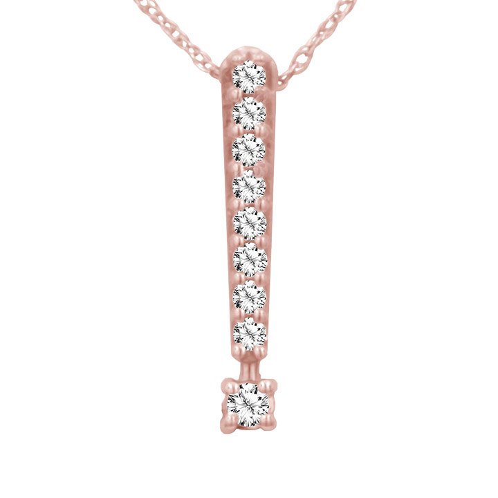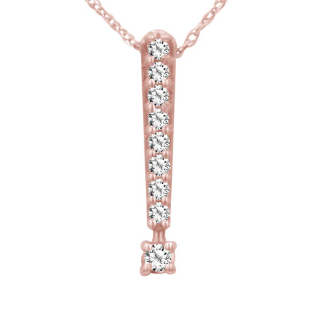 Antwerp Diamond’s “Exclamation Point” vertical pendant is an expressive piece for everyday wear. It features a striking row of diamonds on a vertical bar pendant set in 14k rose gold with a larger diamond on the point. The necklace sparkles with 9 round brilliant-cut diamonds weighing .15 carats, and the pendant is suspended from a 14k yellow gold 16” cable-cut chain. Each diamond is prong-set by master craftsmen.