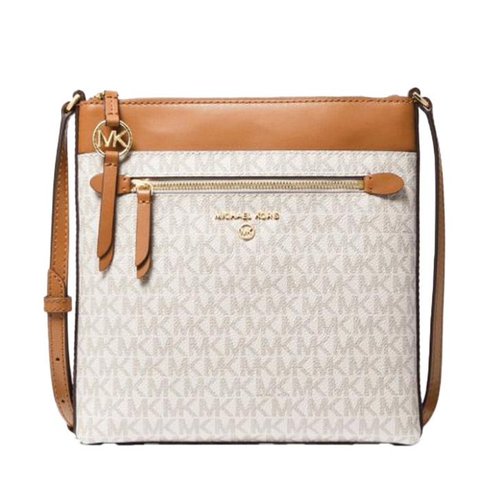 This Jet Set smartphone crossbody bag from Michael Kors combines Signature log-print canvas and leather with polished gold-tone hardware for a luxurious look. It features a back snap pocket that opens to a discreet compartment for safely storing your phone. The bag has multiple interior pockets, fastens with a snap closure, and is crafted from environmentally responsible leather. Measures 14” x 6” x 18”.