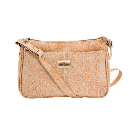 Versatile and chic with a beautiful front embroidered zipper pocket, this compact shoulder bag from Bent & Bree has an adjustable strap so it can also be used as a crossbody. Made of vegan cork, the bag measures 12” x 3.5” x 7.5”.