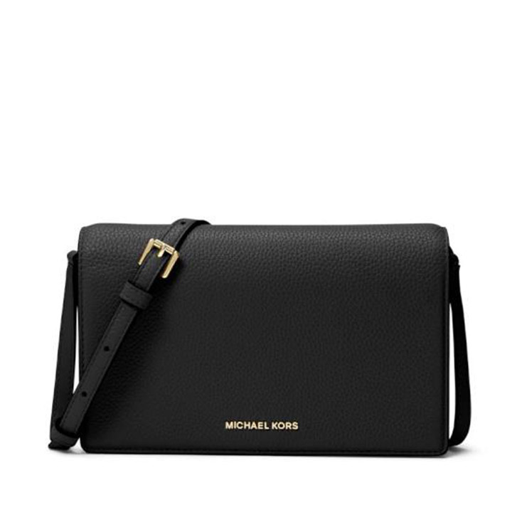 The latest Jet Set crossbody bag combines style and convenience. Made from pebbled leather with gold-tone hardware. It has an adjustable strap from 21.5" x 24" and a structured front-flap design. The interior features pockets and a front zip compartment lined with polyester. It also includes a back slip pocket and secures with snap closure. Available in various colors. No dust bag included.