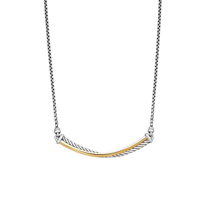Using a dynamic range of smooth and cabled strands, the Crossover Bar Necklace from David Yurman explores the rhythmic weaving of line to create form and movement. It features sterling silver with 18K bonded yellow gold on the adjustable length 1.7mm by 16"-17" chain.