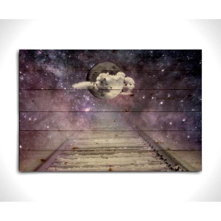 Step into a dreamscape where the earthly meets the ethereal in "Track for the Night Train," a captivating photograph by Hal Halli, proudly printed in the USA. This surreal image invites viewers to embark on an imaginative voyage along a mystical railway that seems to lead directly into the cosmos. Perfect for dreamers and stargazers, this artwork will inspire and elevate any space with its otherworldly charm. 20" x 30" Image size.