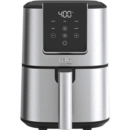 The bella PRO 4-qt. Touchscreen Space Saving Air Fryer will fit perfectly in your kitchen. Featuring 5 preset settings and an adjustable temperature up to 400F you can easily cook your favorites for friends and family (up to 3.3 lbs. of food). The 60-minute auto shut-off timer ensures precise cooking results every time. Made without PFAS PFOA PTFE Lead and Cadmium the EverGood Ceramic Nonstick Coating gives you confidence peace of mind when using this air fryer while dishwasher-safe parts simplify the cleanup process and save you valuable time. Powered by high-performance circular heat technology this air fryer evenly circulates heat for quick crispy and perfectly cooked food.